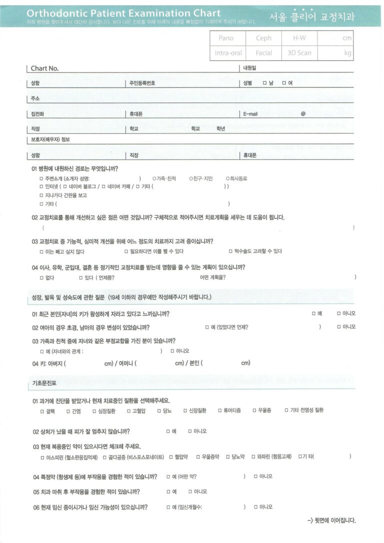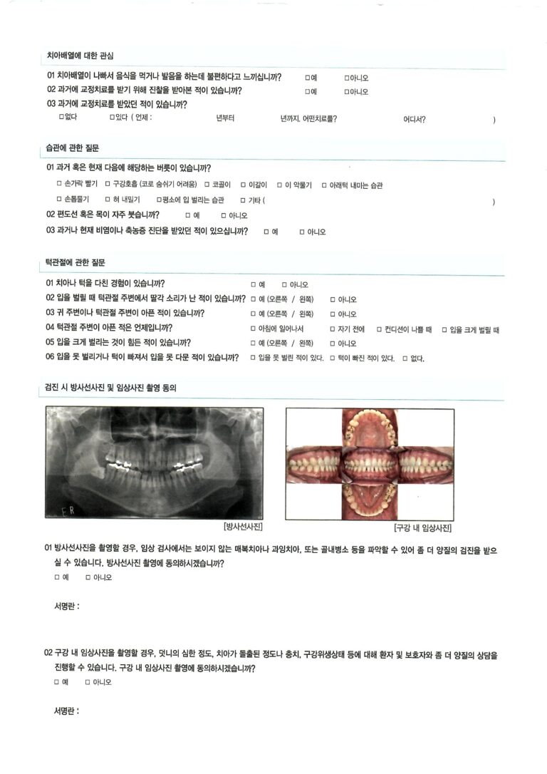 설문지 작성을 통해 환자분께서 교정치료를 통해 어떤 점을 개선하고 싶은지 확인하고, 전신병력과 턱관절 병력들도 확인합니다.